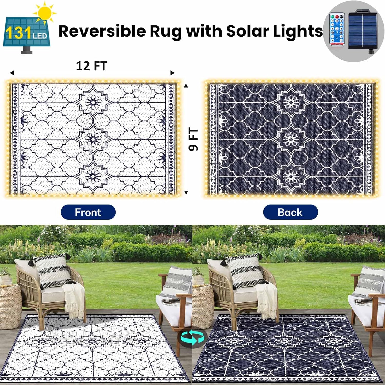 9x12Ft Outdoor Rug, Solar Powered Outdoor Rug with 131LEDs Strip Lights for House Deck, Waterproof Plastic Reversible Outdoor Straw Rugs, Rugs Mat RV Camping Patio Beach Balcony Picnic (Blue White)