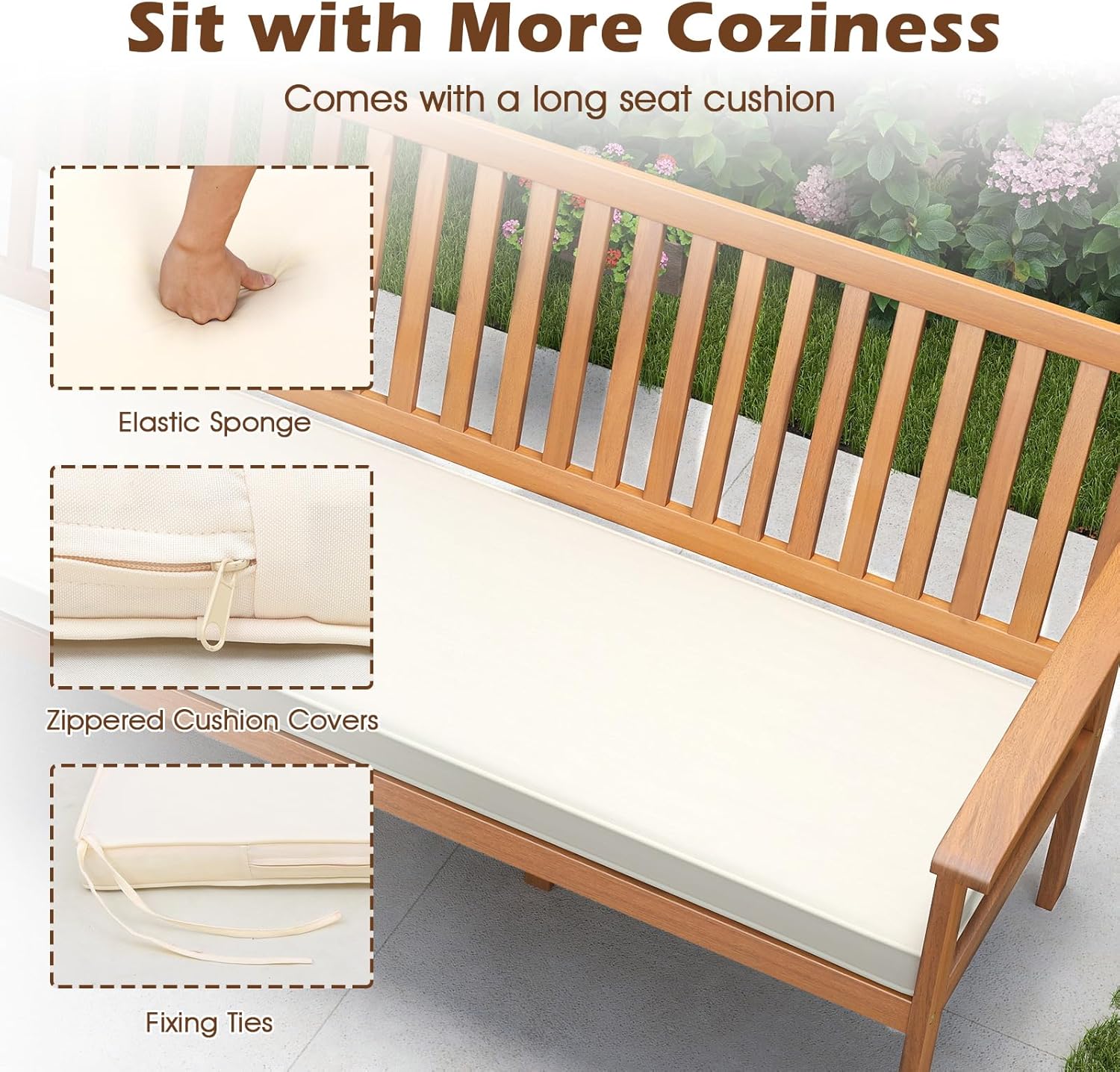 The patio bench features a 60'' x 17.5'' seat that can comfortably accommodate up to 3 people, weighting up to 1200 lbs. Crafted from sturdy acacia wood, it includes a luxurious cushion for added comfort. The removable cushion cover allows for easy cleaning, while the slatted seat provides a cool and airy feel, ideal for hot summer days. The bench boasts an ergonomic design with a 105° inclined slatted backrest and smooth armrests for maximum relaxation. Its versatile design seamlessly complements both indoor and outdoor decoration, suitable for park, garden, patio, porch, yard, poolside, and more.
