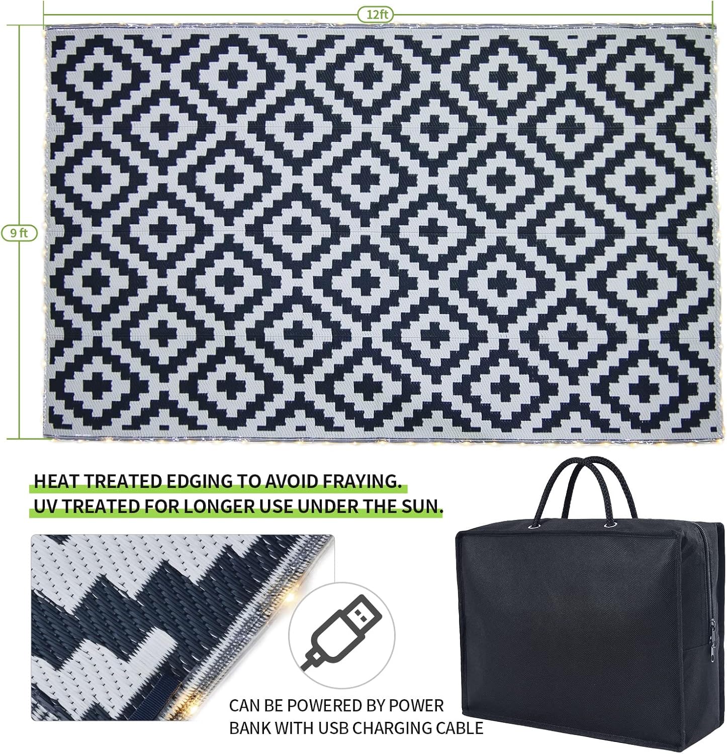 URBEST Outdoor Camping Mats Rugs Reversible Waterproof RV Deck Porch Plastic Rugs Led Illuminated Patio Mat Black-White 9x12 Feet