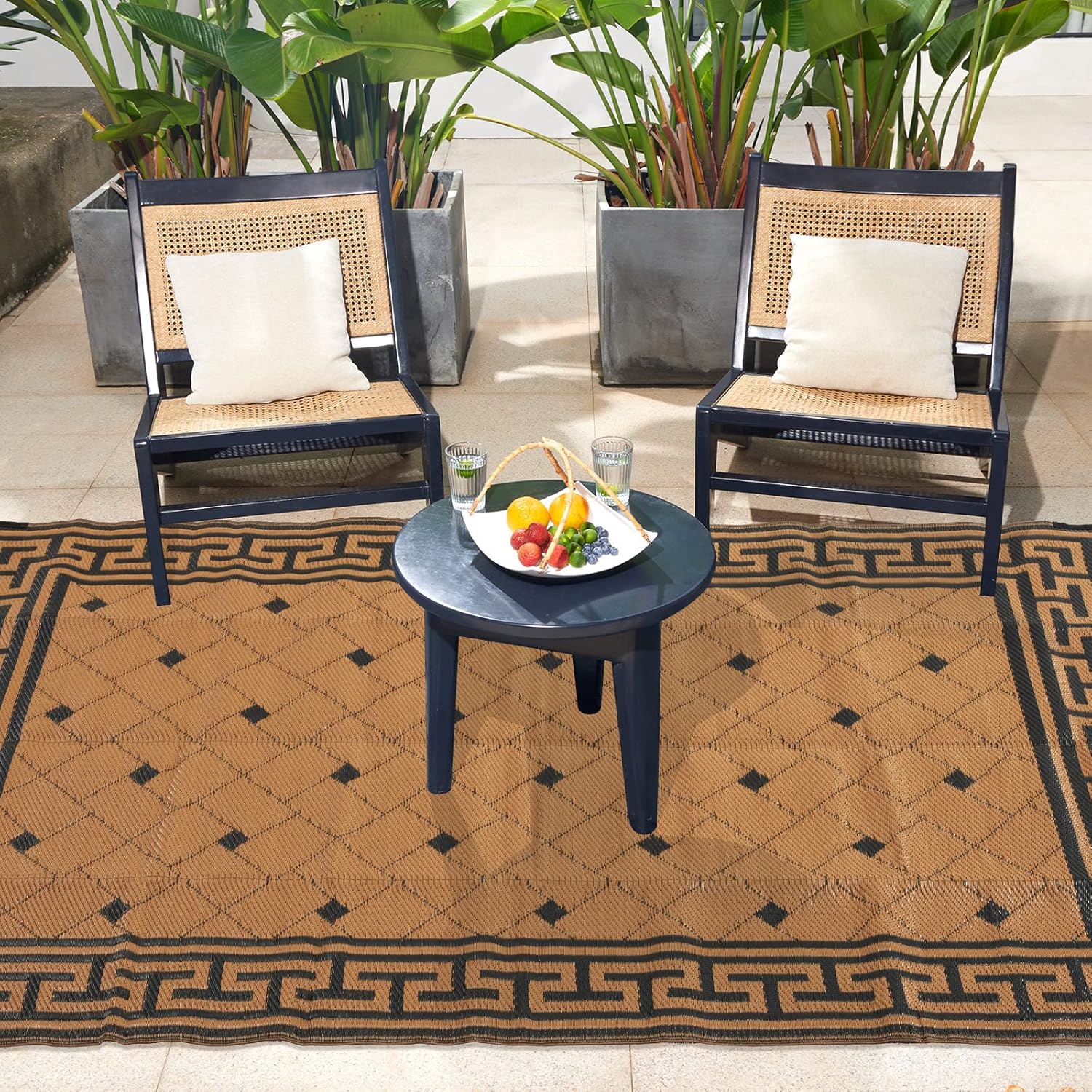 UV coated to protect against fading and other sun damage. With timeless design, this plastic patio rug is elegant as it is functional, use on your patio with outdoor furniture and accessories to show off your personal style.